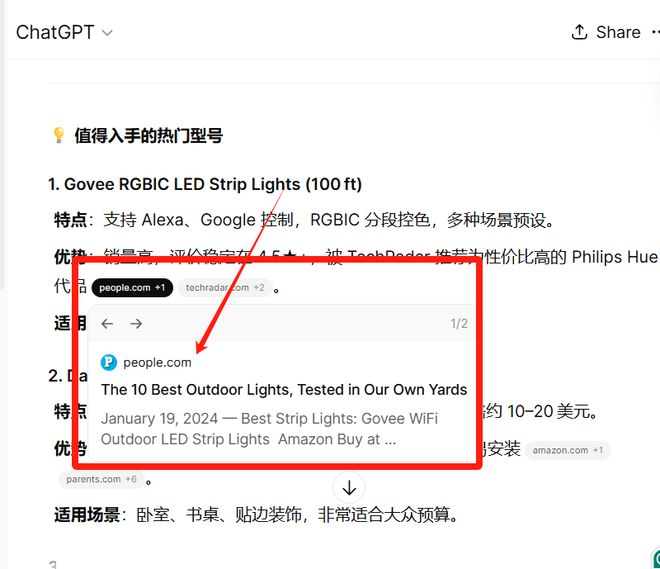 GEO的目标,就是让你的网站内容,被AI大模型采纳、引用、整合,成为它生成答案的核心信息源。如下截图是让ChatGPT给纽约的卖家推荐LED灯带的店铺链接。
