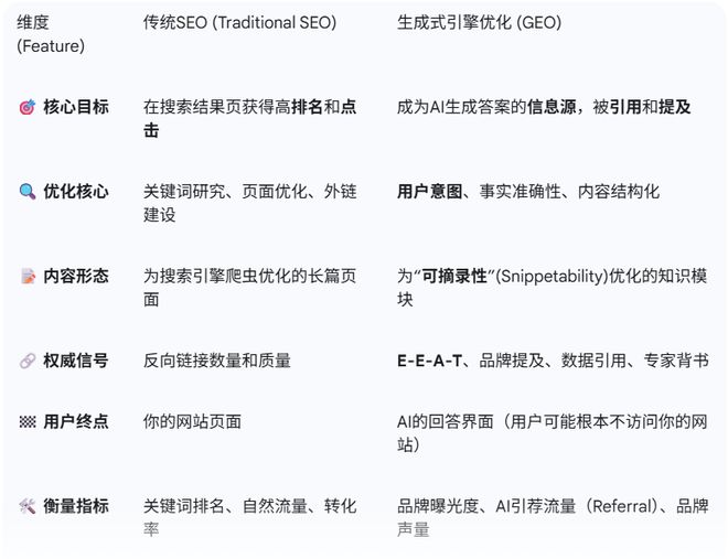 对于传统的SEO特别追求的是要点击我的网站,要进入我的网站,然而,现在AI时代的GEO让你不要执着于被点击,被访问。要追求你的内容被引用。这个是让传统SEO很难接受的。