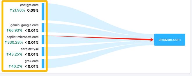 以Amazon.com为例,SEMrush分析GEO流量来源如下: