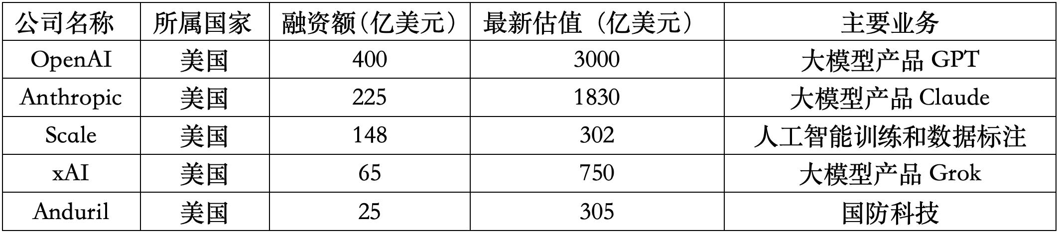 超级独角兽的崛起是本轮AI投资集中化最直观的体现。在近一年来相继完成巨额融资之后,全球估值前十的独角兽之中,已经有四家AI企业(大模型开发商OpenAI、Anthropic和xAI,数据智能和AI平台服务商Databricks)。这些企业的核心价值在于它们对算力、算法和模型的掌握,它们代表了当前市场对于AGI(通用人工智能)潜力的最高定价(表2)。