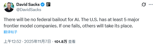 白宫的AI事务专员大卫·萨克斯也在周四表示,美国政府不会为AI产业提供联邦救助。萨克斯也表示,话虽如此,白宫的确希望简化许可流程并促进发电。