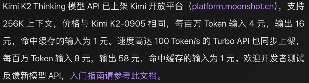 以K2 Thinking为例,其官方提供的API价格是每百万输入token收费4元(命中缓存时更低至1元)、输出token16元。